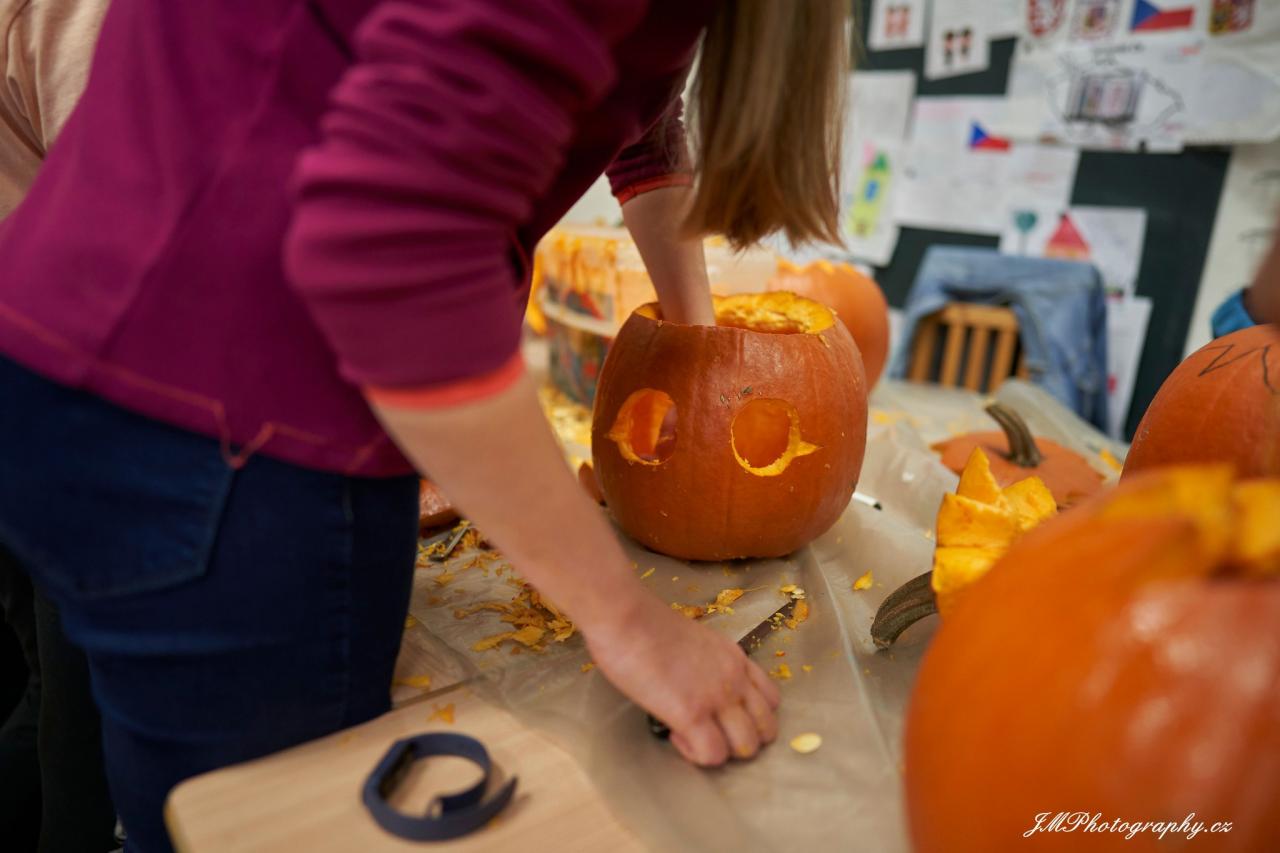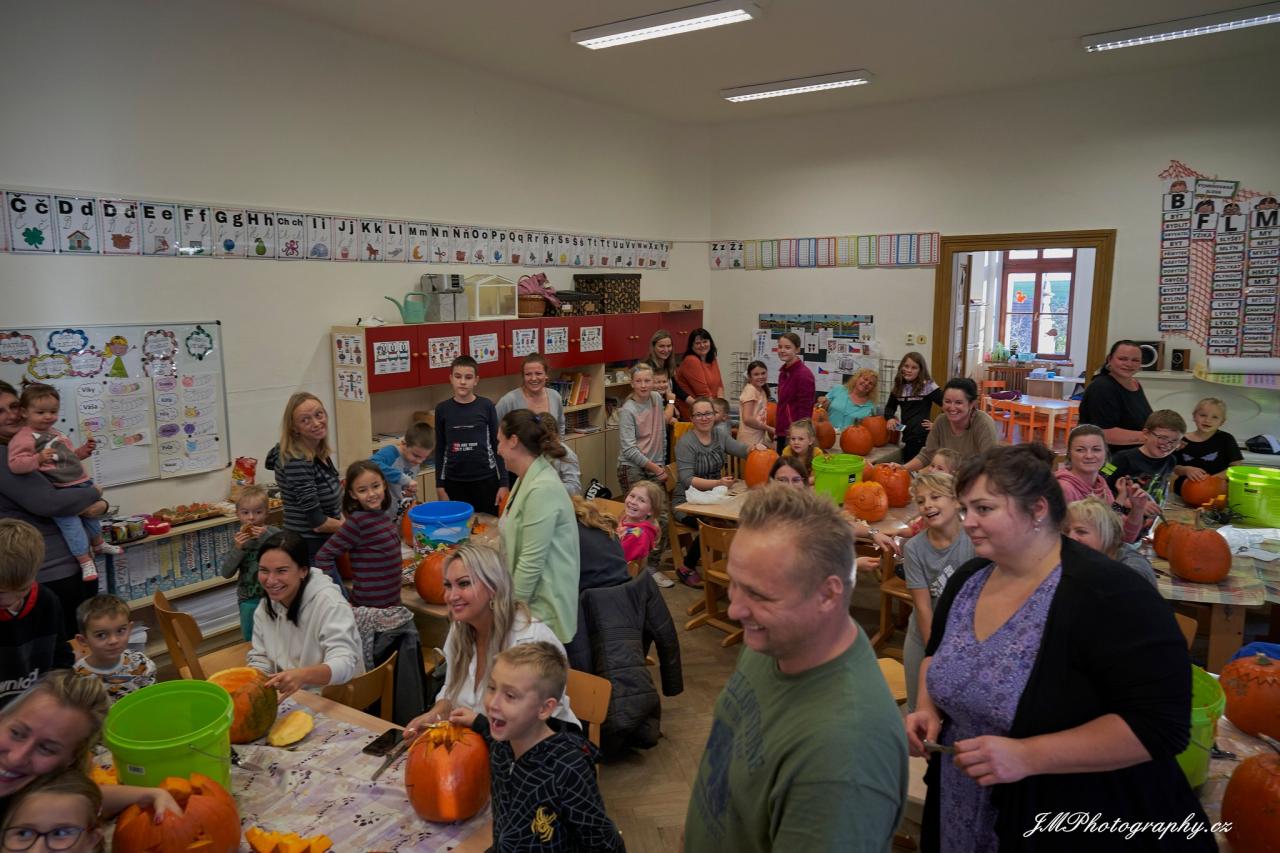 Dlabání dýní s dopomocí rodičů a učitelů z MŠ i ZŠ