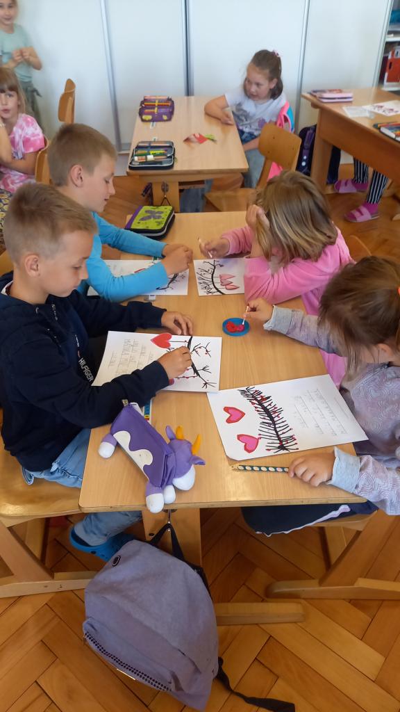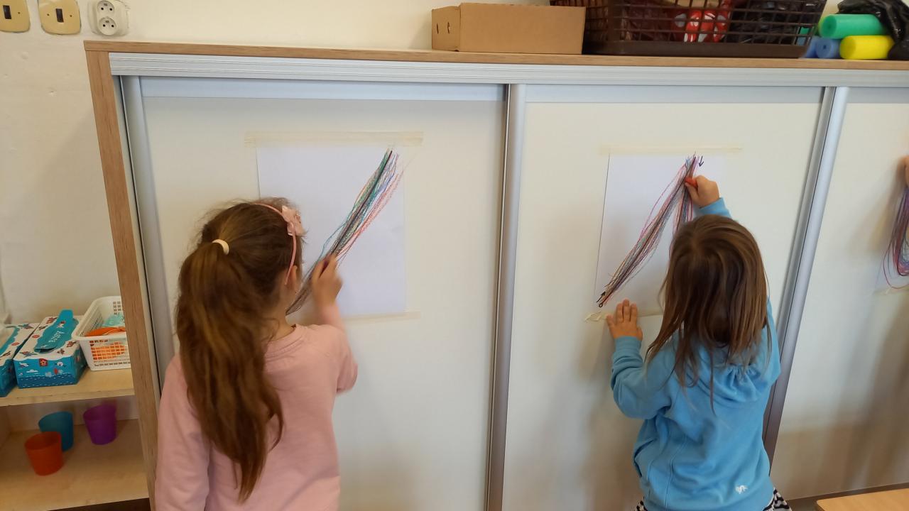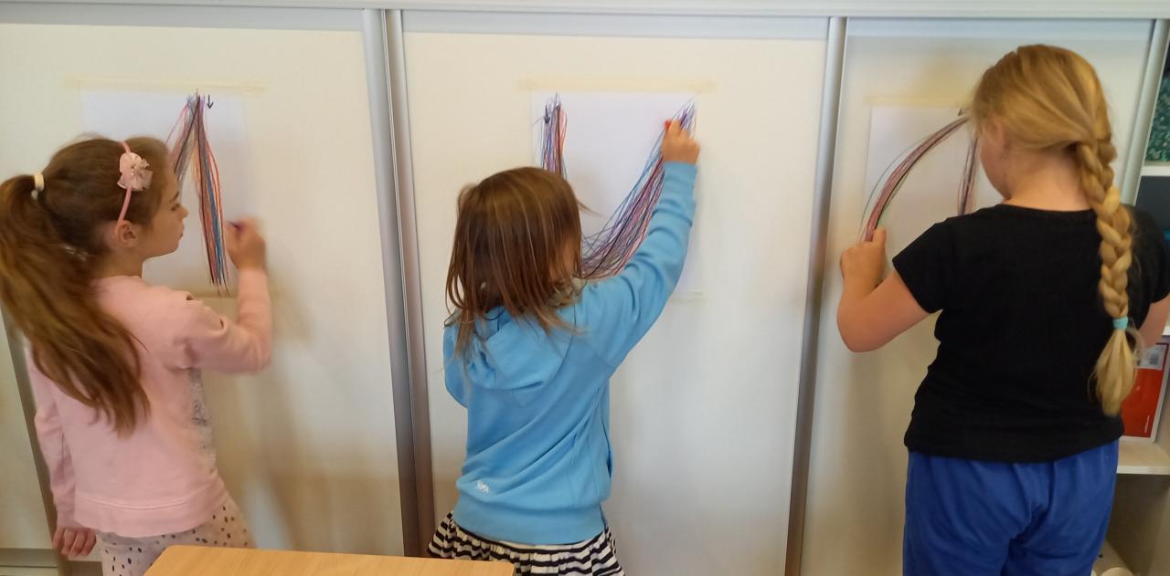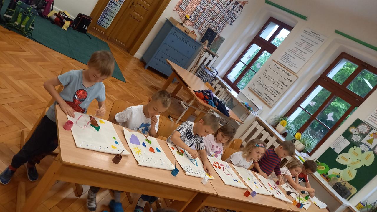 Také jsme společně otevřeli naši venkovní učebnu a těšíme se na dny učení venku. Zatím jsme si vyzkoušeli dvě hodiny výtvarné výchovy. Trochu nás zlobil vítr, ale všechny nás to bavilo.