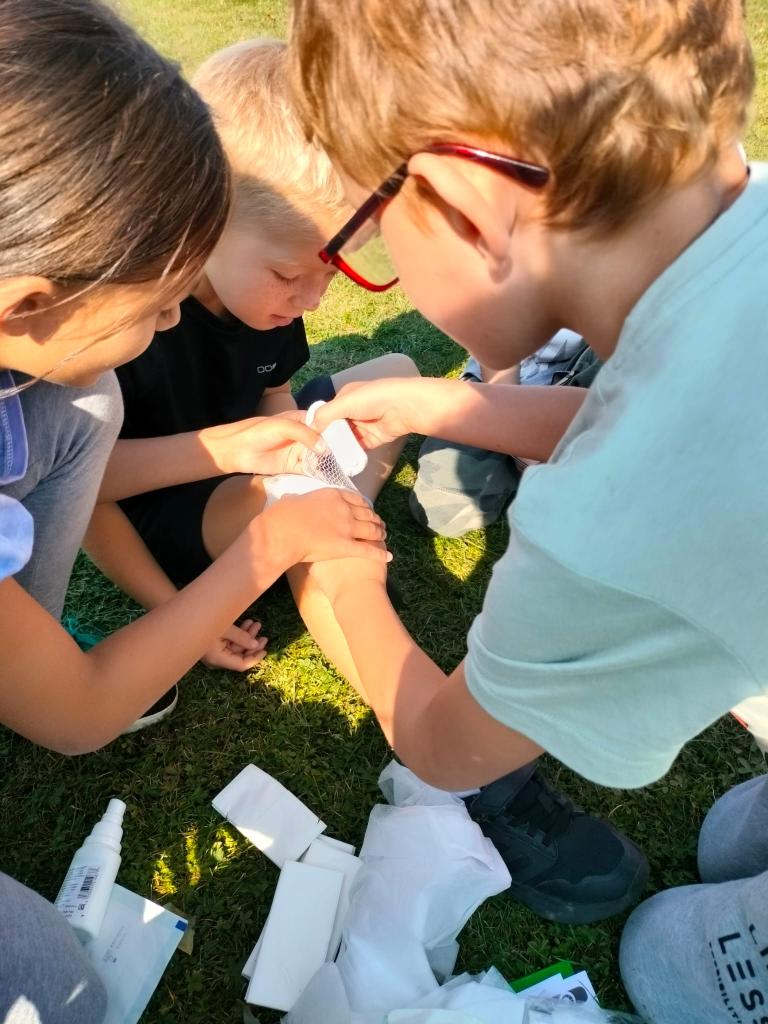 Ve čtvrtek 19.9. si všichni žáci naší školy vyzkoušeli jaké je to postarat se o druhé kamarády při potížích, zopakovali si základy 1.pomoci. Někteří se seznamovali s postupem volání záchranné služby, ošetření úrazu, poskytnutí pomoci úplně poprvé...jiní již zkušenosti měli a připomněli si je. Děti také čekala dopravní výchova - dopravní značky, situace a bezpečné chování.