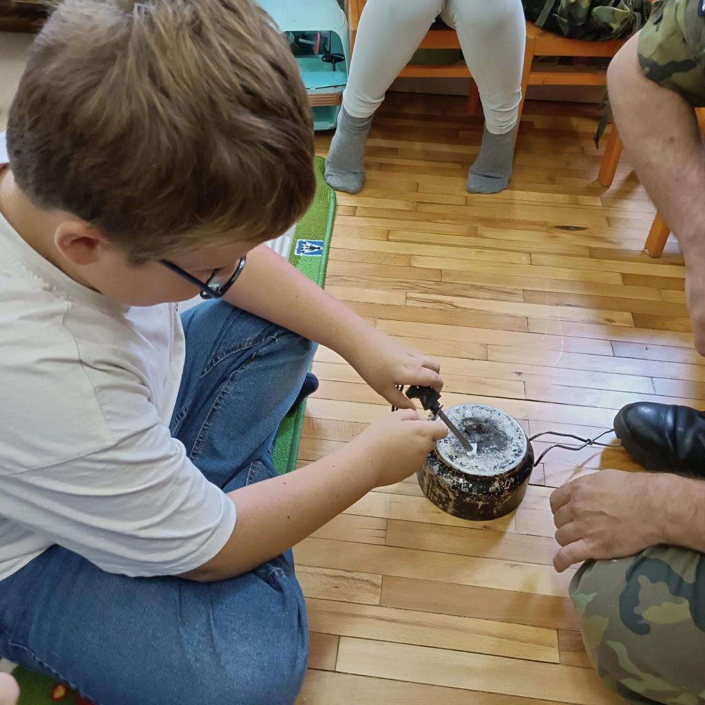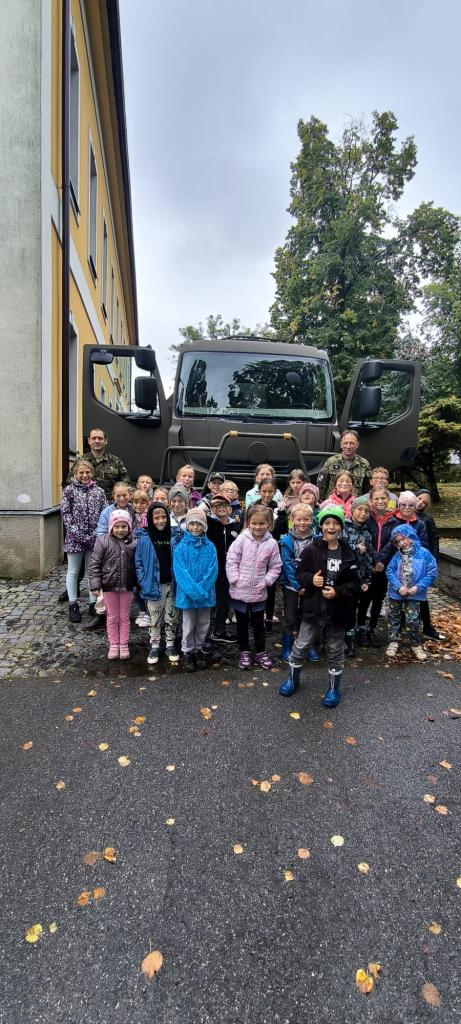 Navštívili nás členové armády České republiky (POKOS ARMY) 🎖️. Seznámili jsme se s režimem u armády. Mohli jsme si osahat makety zbraní a výstroj 🪖. Povídali jsme si o přežití v lese a zkoušeli jsme pomocí křesadla rozdělat oheň 🔥. Seznámili jsme se se zdravotnictvím v armádě ⛑️. Viděli jsme také vojenskou techniku - Tatru a osobní automobil Army .