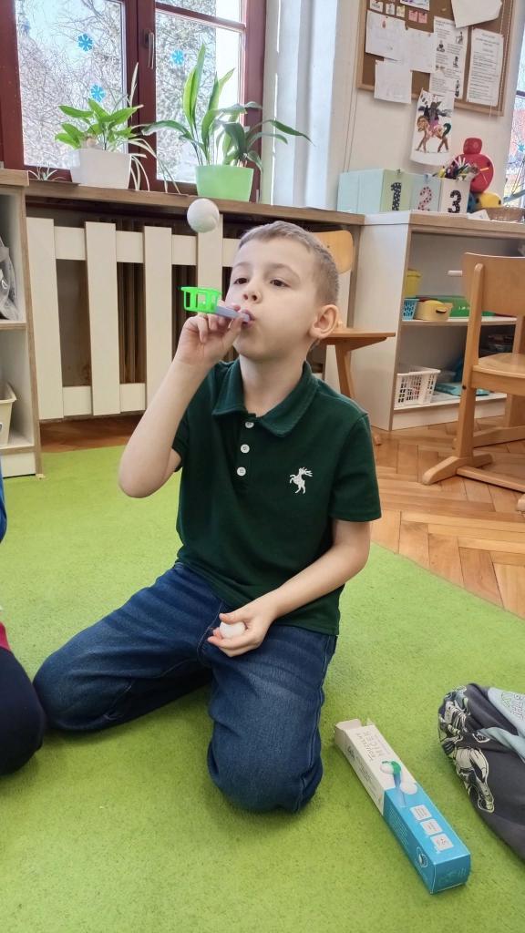 Pro rozvoj správného dýchání jsme využili kouzelný míček, se kterým si děti hravou formou trénovaly dechovou techniku. Zahráli jsme si na živé puzzle a pomocí zvuků zvířátek hledali správné dvojice. ![]()